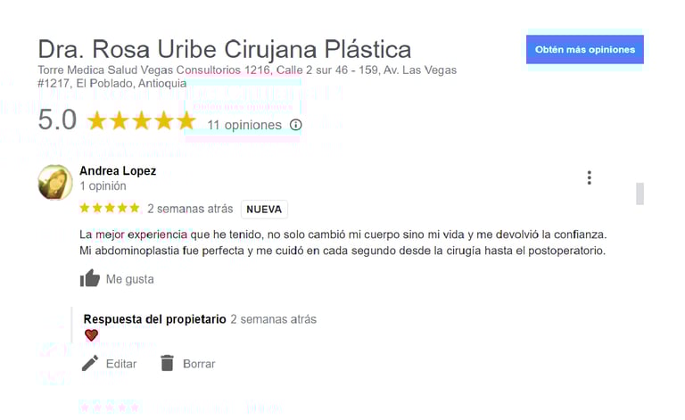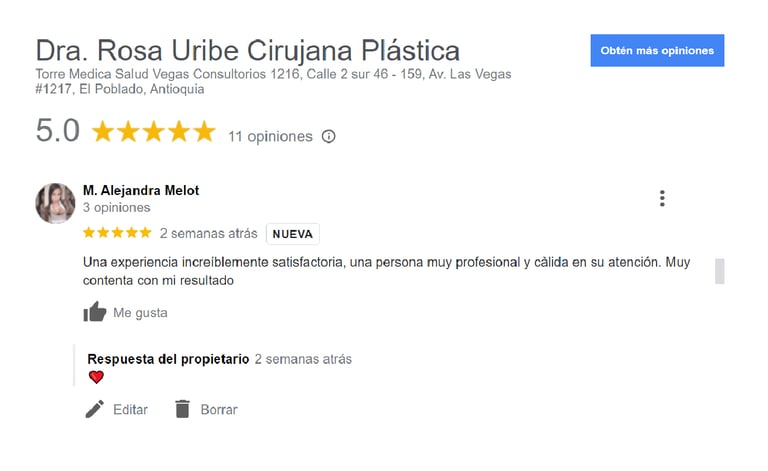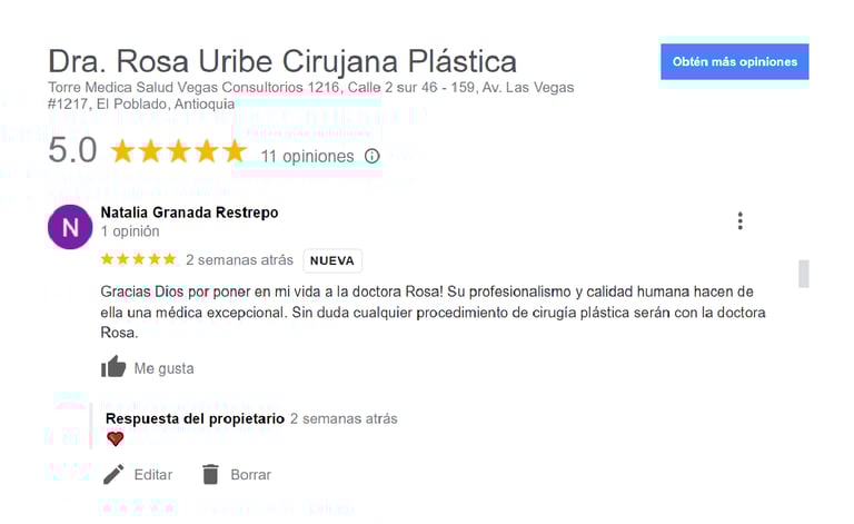 Comenta sobre tu experiencia con la Doctora Rosa Uribe Cirujana Plástica y ayuda a otros a encontrarnos en Google.